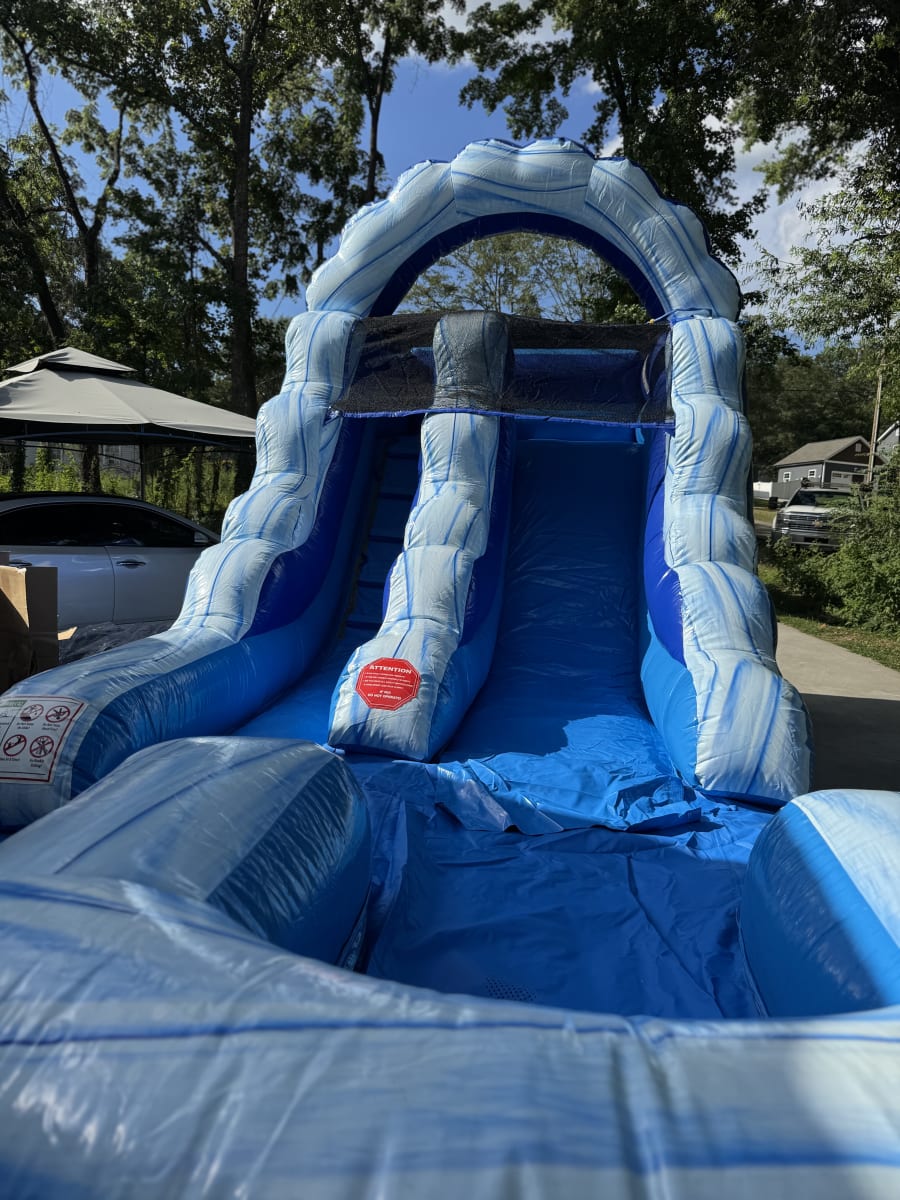- Eye-Catching Design: The vibrant wavy sky pattern and bold blue color make this water slide a standout attraction at any event.